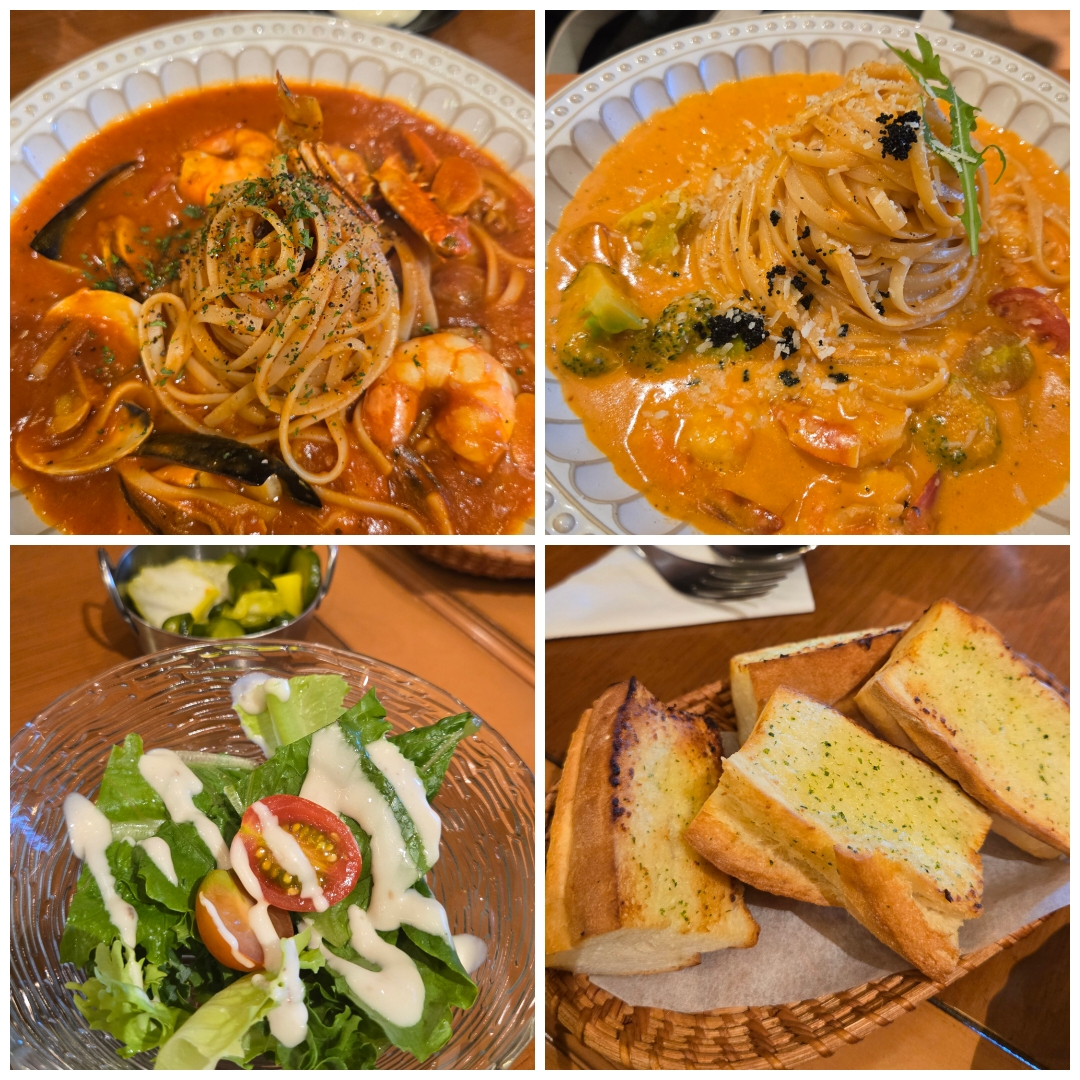 해산물도 넉넉하게 들어가 있었는데, 통통한 새우와 쫄깃한 오징어가 풍성하게 들어 있어 식감의 재미까지 더해줬습니다. 소스와 해산물의 조합이 환상적이어서 포크질을 멈출 수 없었고, 남은 소스를 아깝지 않게 빵에 찍어 먹었더니 또 다른 별미였어요.